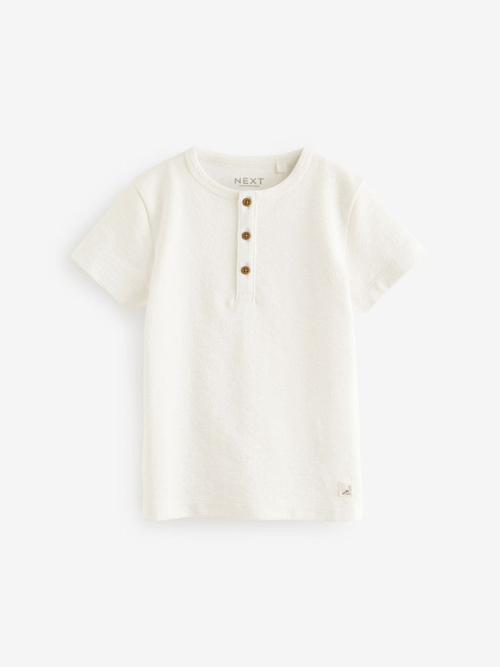 Freshen up their t-shirt rotation with this smart-casual staple, featuring a Henley-style button-up neck, a white cotton-blend fabric and short sleeves, finished with a woven tab. Regular fit Cotton-blend Henley neck Woven tab Machine washable. 60% Cotton, 40% Recycled polyester. Country of Origin: Bangladesh
