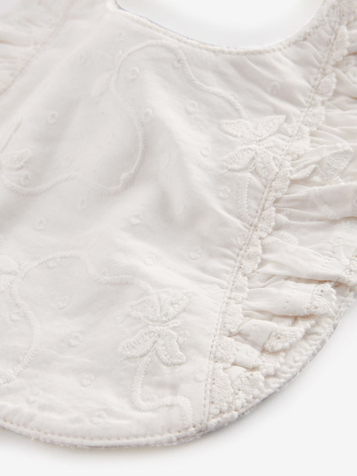 Our white single-occasion baby bib features delicate embroidery, making it perfect for a special occasion. Crafted from a supersoft and absorbent fabric, this bib ensures comfort and functionality for your little one. It also comes with a convenient popper snap fastening for easy wear. Main 100% Cotton. Lining 85% Cotton, 15% Polyester. Country of Origin: India Warning: Keep away from fire and flames., Better Cotton - By choosing our cotton products, you're supporting our investment in Better Cotton's mission to help cotton farming communities survive and thrive while protecting and restoring the environment. This product is sourced via a system of mass balance and therefore may not contain Better Cotton. Learn more at www.next.co.uk/better-cotton