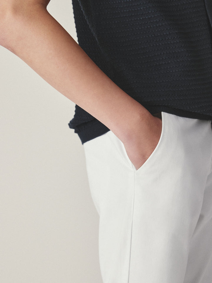 Chino style Skinny fit Cotton-rich stretch fabric Zip fly with button fastening Pockets Belt loops Folded hems Comes in white colour 98% Cotton, 2% Elastane. Country of Origin: Bangladesh
