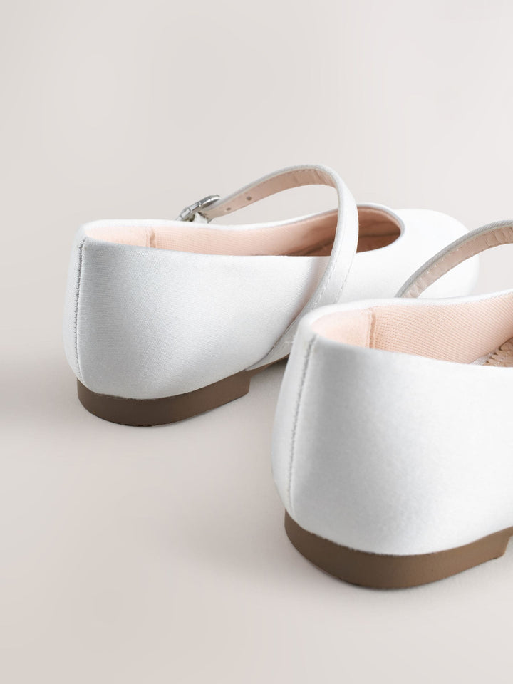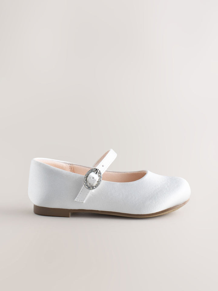 Make her feel like a princess with these charming white Mary Jane shoes, perfect for a flower girl or any special occasion. The soft finish and classic design create a beautiful, elegant look. Featuring an adjustable buckle fastening and a slip-resistant durable sole, these shoes are both secure and comfortable for dancing the day away at a party or formal event. Adjustable buckle fastening Slip-resistant durable sole Wide Fit Mary Jane shoe style Smart/Occasion/Party use Round top Upper - Textile, Lining & Sock - Textile, Other Materials, Sole - Other Materials. Country of Origin: China